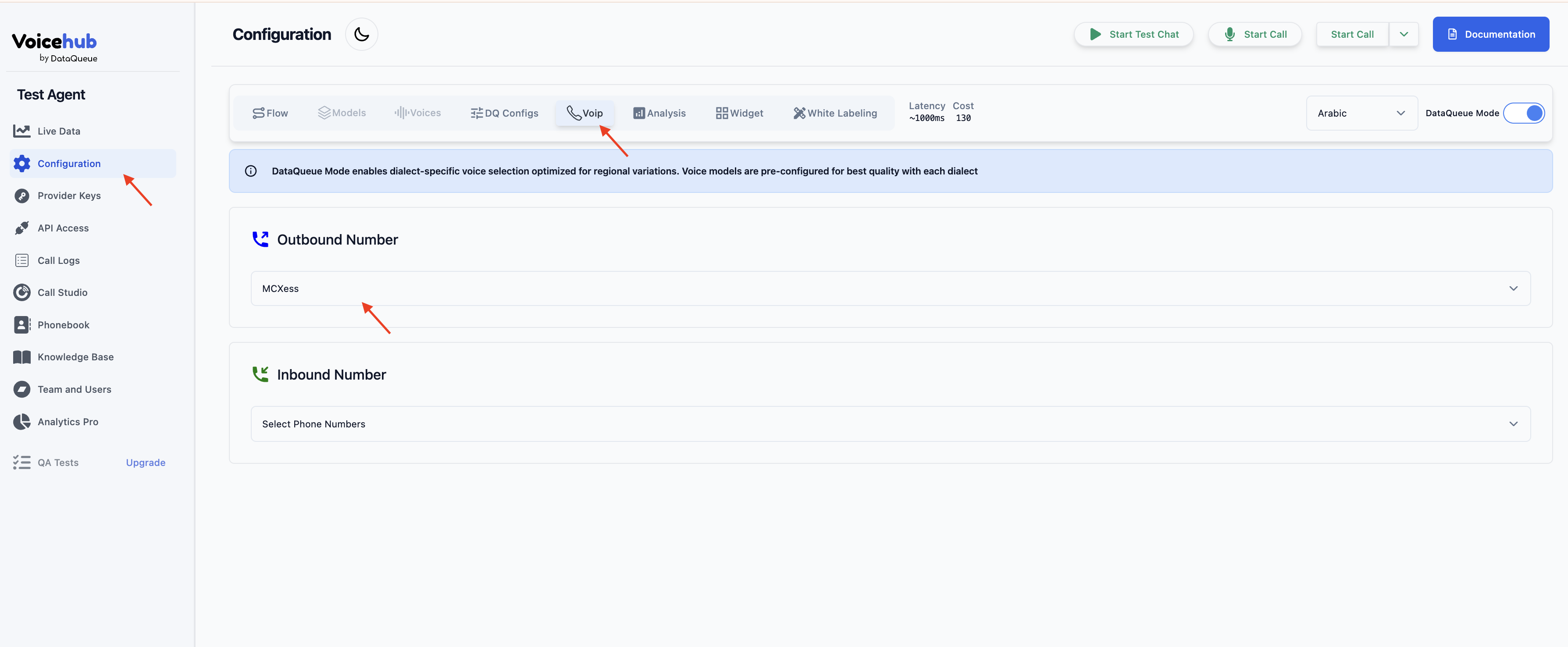 Under the Configuration Menu, there is a VOIP config tab that is used to select an outbound phone number/provider. Once configured, triggering API can be used along with the API key to trigger outbound voip calls